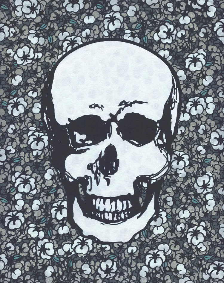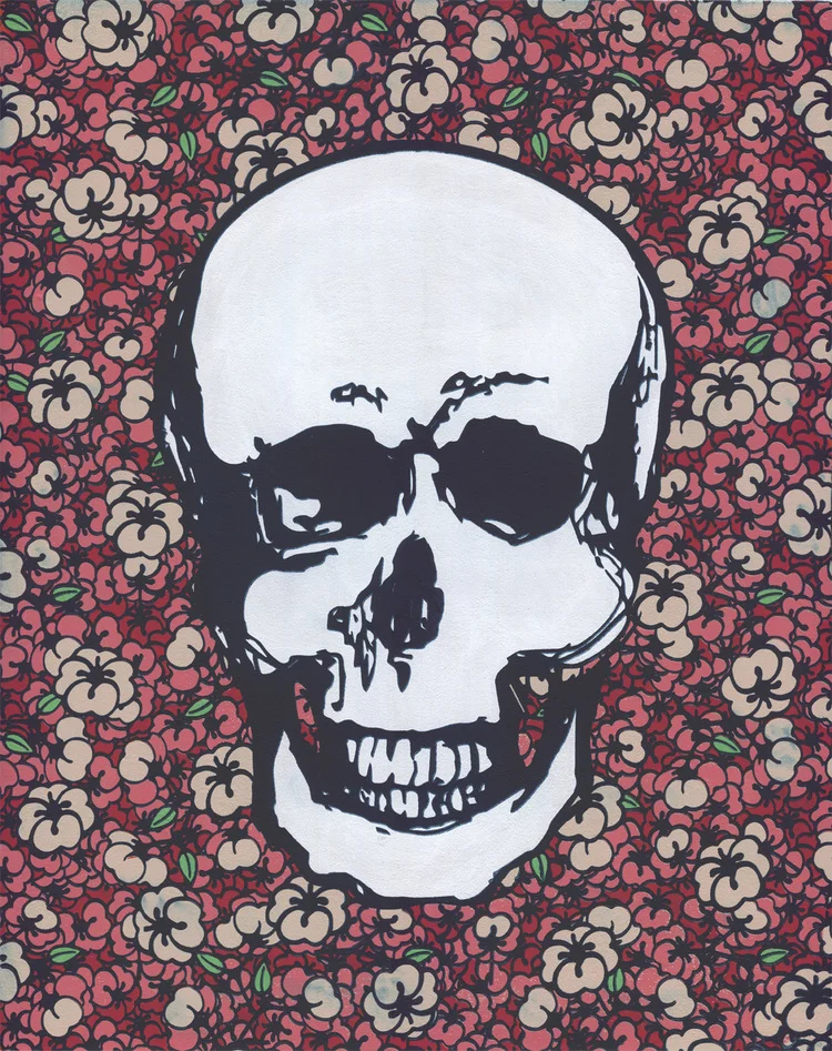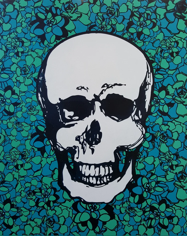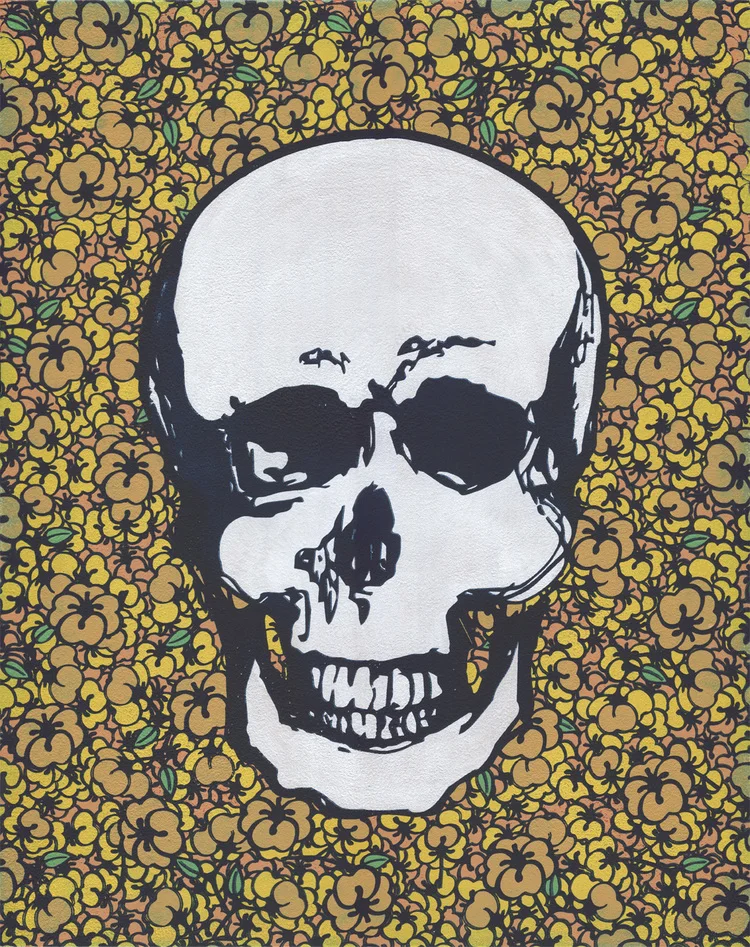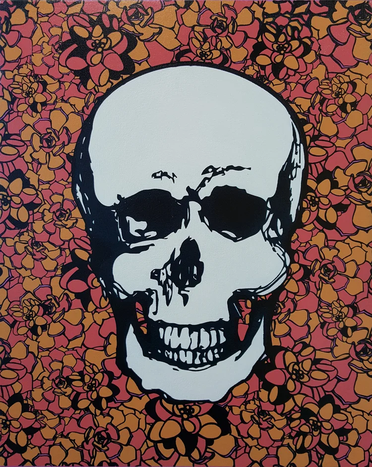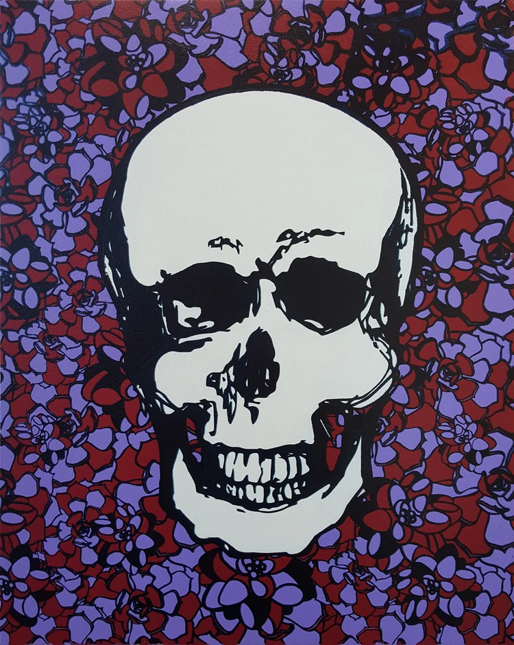 A series of colorful acrylic works based on hand-drawn inky illustrations of skulls and daisies that have been digitized, painted, and then screen printed onto canvas mounted on 27 x 16 x 2.5 inch hardwood panels.