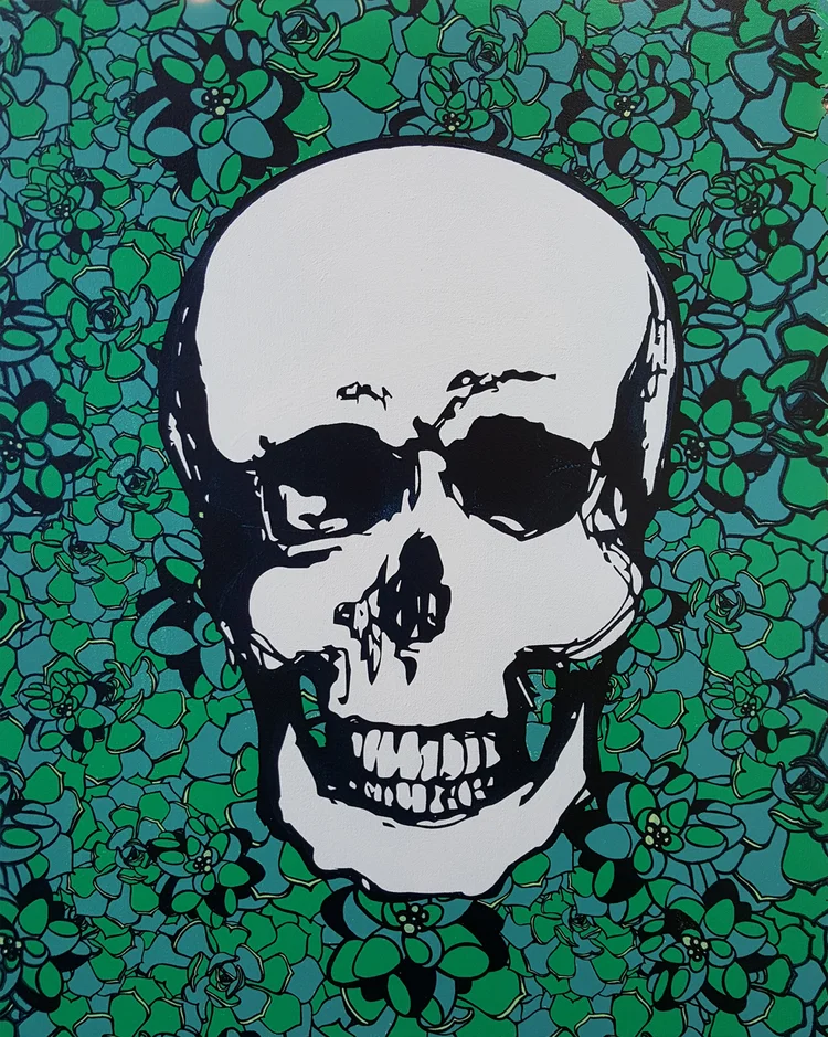 A series of inked illustrations that are digitized, screen printed, and then painted on canvas wrapped around hardwood panels. I was inspired to use some of the most clichéd pop culture signifiers - skulls, flowers, and succulents due to their impersonal monotony, their fluid meaning, and their ability to generate aesthetic pleasure.